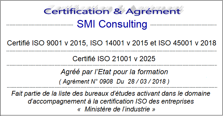 - SMI Consulting est un centre de formation agréé par l'état pour la formation (Agrément N° 0908 du 28/03/2018).